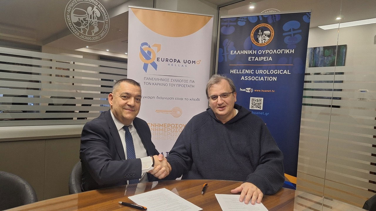 Ο Πρόεδρος της Ελληνικής Ουρολογικής Εταιρίας κ. Ανδρέας Σκολαρίκος και ο Πρόεδρος της Europa Uomo Hellas κ. Δημήτρης Δεληγιαννίδης προχώρησαν στην υπογραφή Συμφώνου Συνεργασίας και Κοινών Δράσεων, σηματοδοτώντας την έναρξη μιας οργανωμένης και ουσιαστικής συνεργασίας μεταξύ της επιστημονικής ιατρικής κοινότητας και της οργανωμένης εκπροσώπησης των ασθενών με καρκίνο του προστάτη στην Ελλάδα.